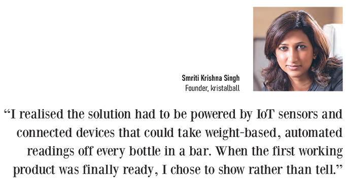 After months of research, she realised the solution had to be powered by IoT sensors and connected devices that could take - automated readings of every bottle in a bar. More than a year of R&D followed, involving prototypes, accuracy tests and long nights of fine-tuning. Learning from failed experiments with large software and hardware developers, she took the build inhouse.