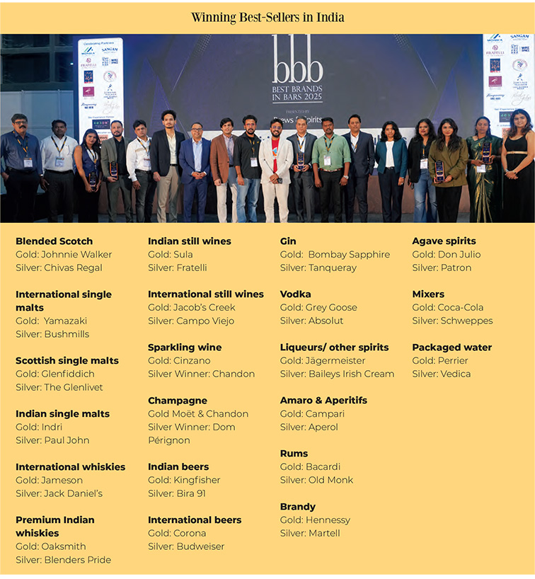 Global leaders – among them Johnnie Walker, Jameson, Glenfiddich, Indri, Grey Goose, Bombay Sapphire, Bacardi, Corona, Kingfisher, Jacob’s Creek, Sula, Moet & Chandon, Hennessy, Jägermeister and Campari – retained their positions across categories.