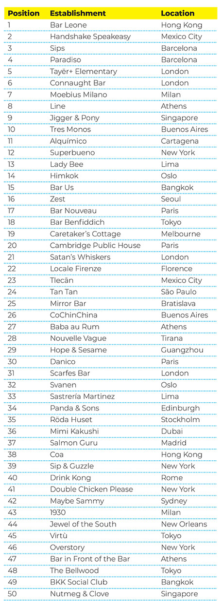 Of the 23 bars in Europe, London continues its reign as the region’s cocktail capital with four bars: Tayēr+ Elementary (No.5), Connaught Bar (No.6), Satan’s Whiskers (No.21) and Scarfes Bar (No.31). They are joined by Edinburgh’s Panda & Sons (No.34).