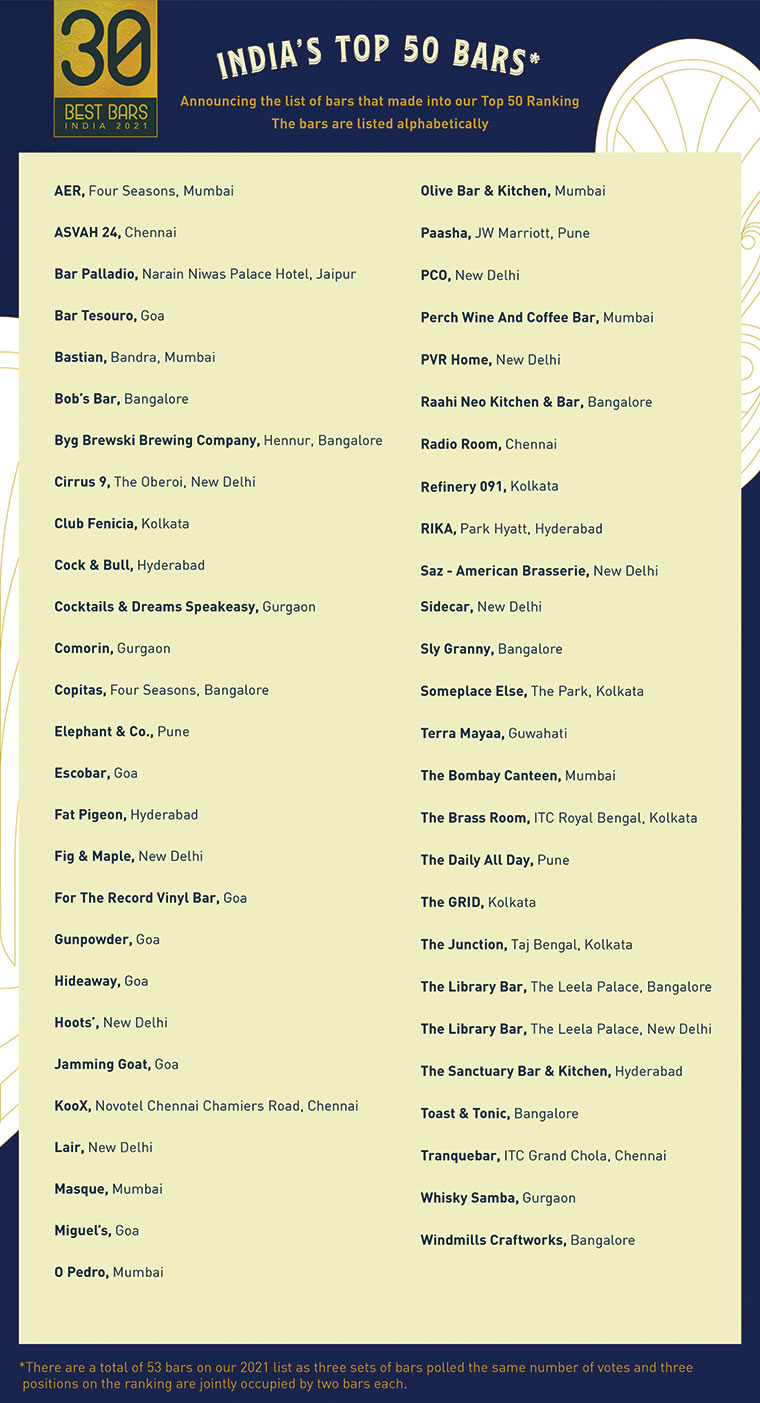 The 30 Best Bars ranking for 2021 will be unveiled at an awards ceremony, which has been re-scheduled keeping in mind the ongoing pandemic. The new dates will be announced as soon as the government eases restrictions.