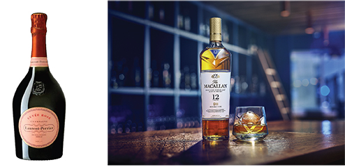 The Whiskey Co., Guwahati, sold out its entire annual allocation of Laurent Perrier Rose Cuvee 96 bottles (L) in a 48-hour sale. The Macallan 12-YO Double Cask (R) comes from Kyndal Group.