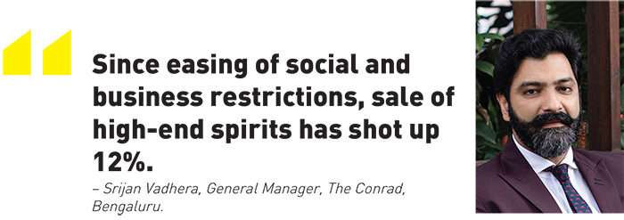 Srijan Vadhera, General Manager of The Conrad, says he has been engaging with brand ambassadors of various beverage brands to help curate experiences for his guests. His high-end spirits sales have shot up 12% after social and business restrictions because of Covid-19 have eased.