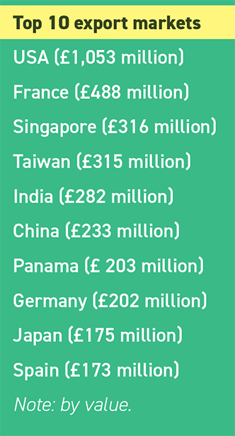 The largest export destinations by volume (700-ml bottles) were: India (219 million bottles +60%), France (205 million bottles +17%), US (137 million bottles +9%), Brazil (93 million bottles +14%), Japan (75 million bottles +33%), Germany (67 million bottles +48%), and Spain (67 million bottles +39%).