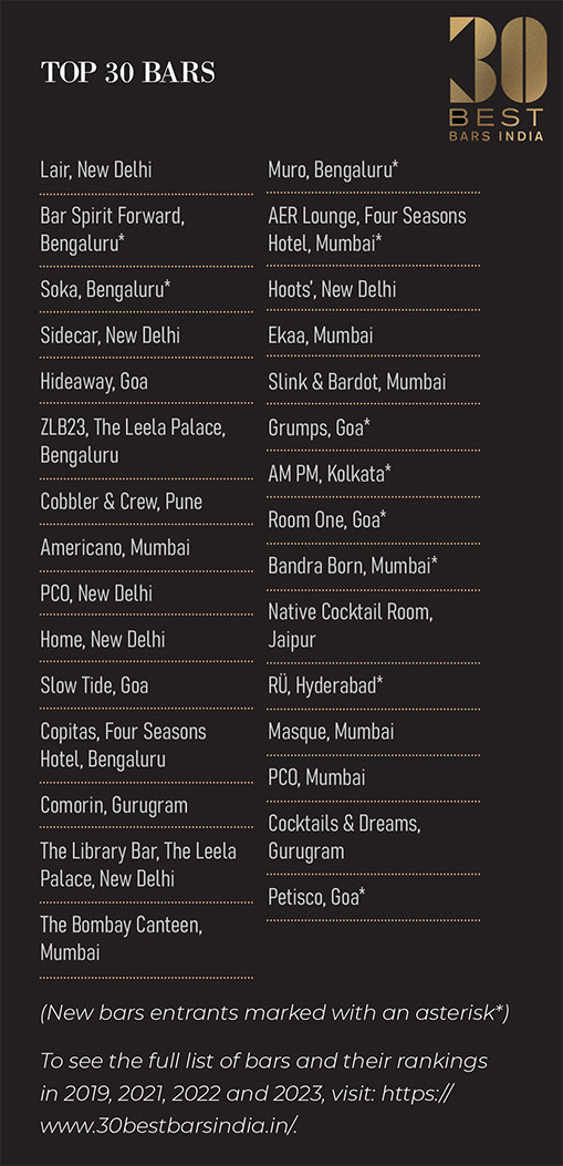 The other top-ranked bars include New Delhi’s Sidecar (#4), Goa’s Hideaway (#5), Bengaluru’s ZLB23 at The Leela Palace (#6), Pune’s Cobbler & Crew (#7), Mumbai’s Americano (#8), New Delhi’s PCO (#9) and Home (#10).