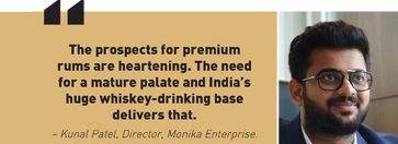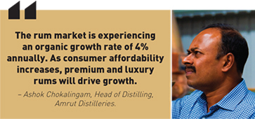 Ashok Chokalingam of Amrut Distilleries says his company has Two Indies, a gold rum in the premium segment, and the dark Old Port rum in the regular segment. “The rum market is experiencing an organic growth rate of 4% annually, as consumer affordability increases, premium and luxury rums will drive growth.”