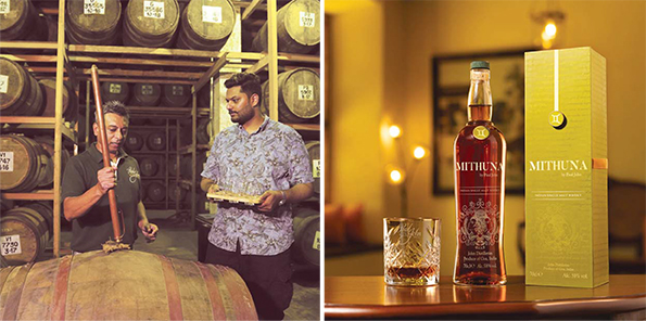 Paul John Distilleries’ Master Distiller, Michael D’Souza (L) is seen at work with Brand Ambassador Yash Bhamre. (R) The new Mithuna single malt whiskey expression, which was rated by Jim Murray as the third-best in his 2020 Whisky Bible.