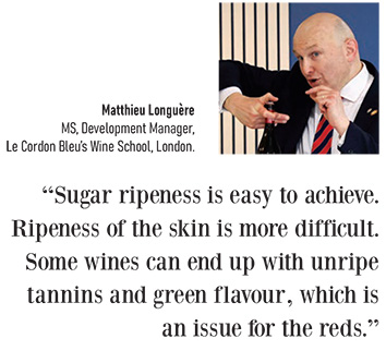 Sugar ripeness is easy to achieve and not an issue. Ripeness of the skin is more difficult with a shorter hanging period of the grapes. Some wines can end up with unripe tannins and green flavour. Which is not an issue for white wines, but an issue for the reds.